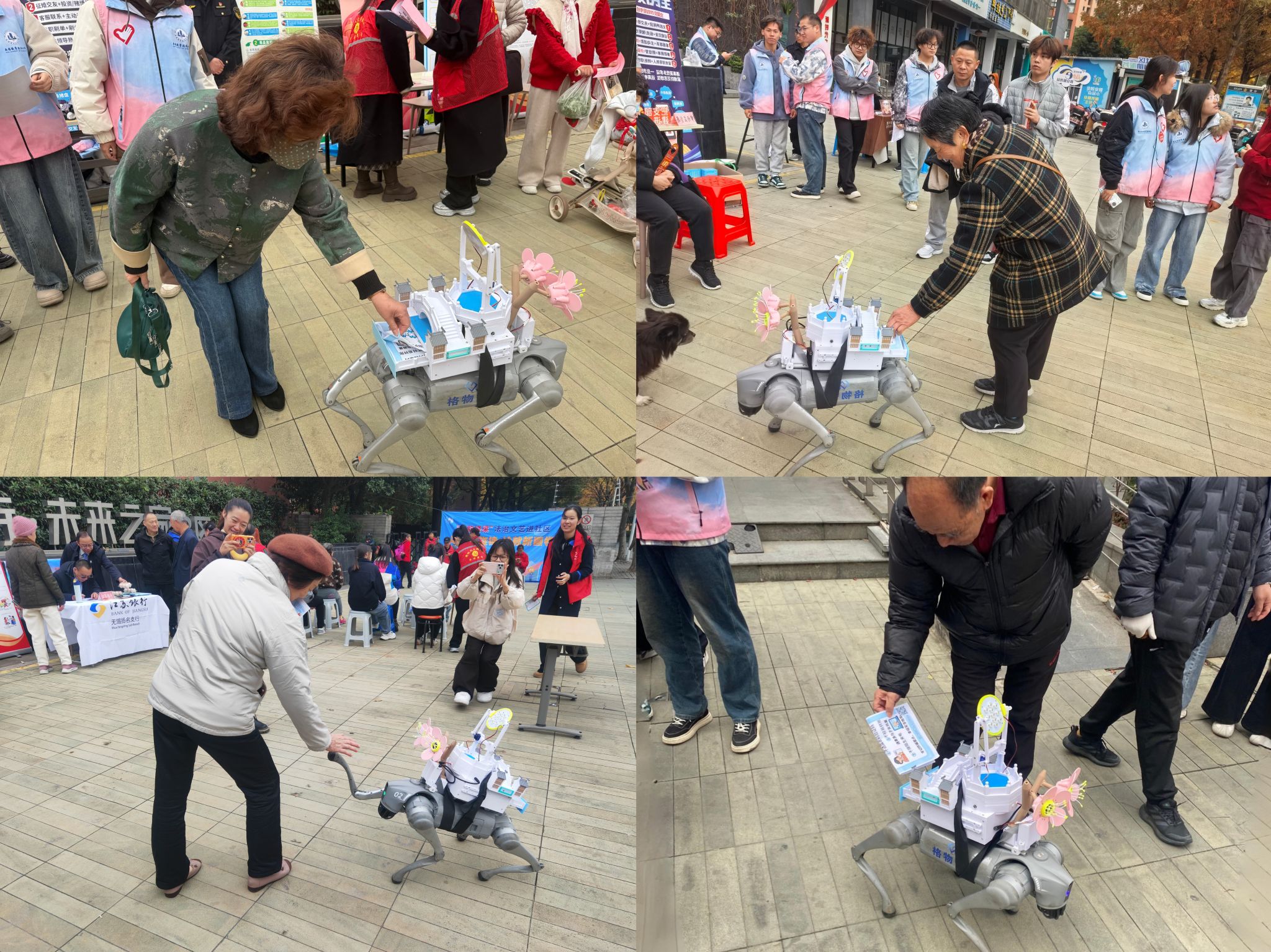 机器狗“芯仔”背着由学院师生自主设计的多功能挂载平台,成为了活动现场的焦点。它不仅能够自主播报反诈知识,与居民友好互动,还可以发放宣传单页,吸引了大量居民驻足互动,打造出趣味化、智能化的反诈宣传新载体。“没想到现在大学生技术这么厉害,把机器狗和社区服务结合,形式很新颖!”王奶奶感叹道。