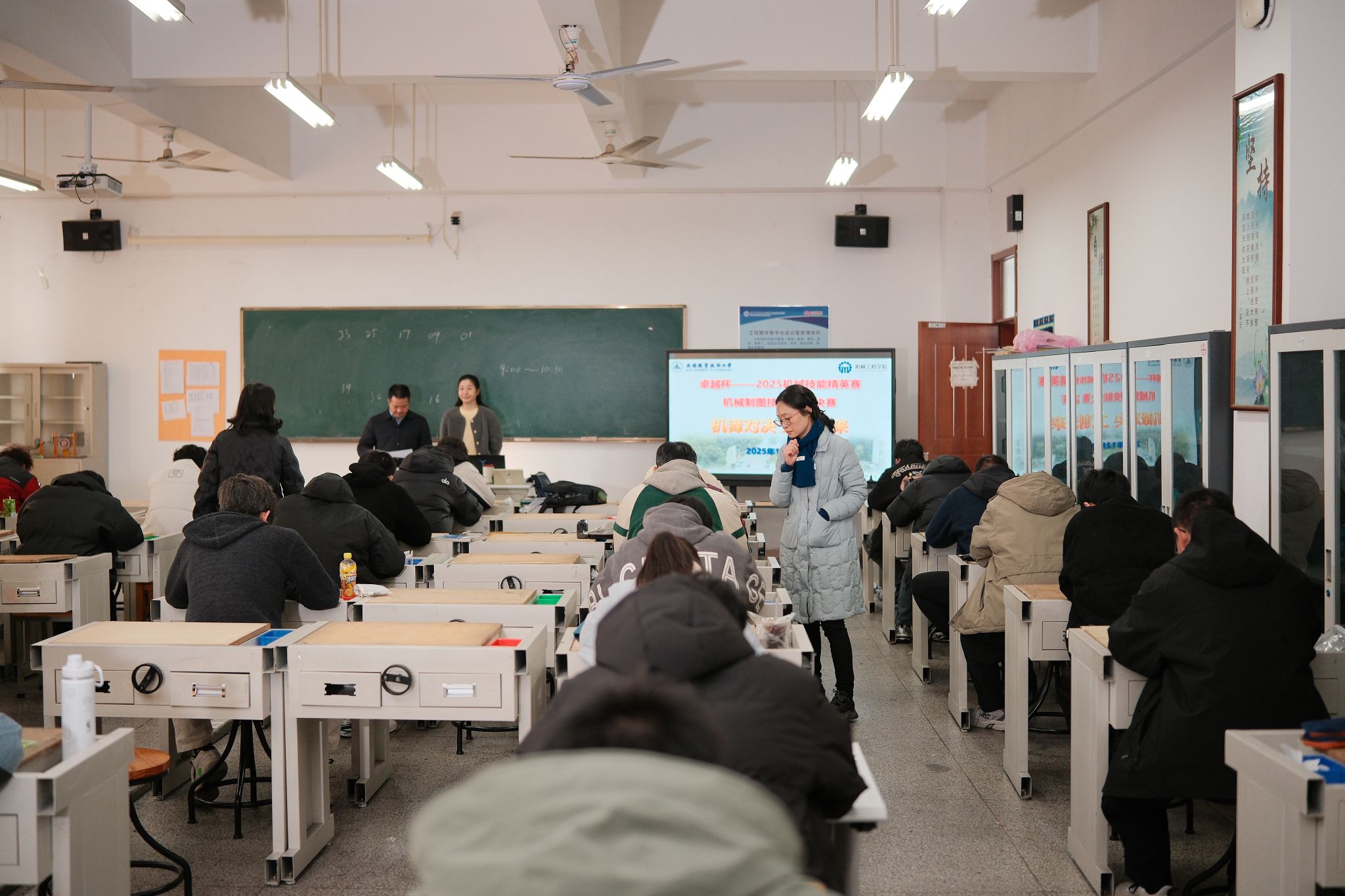 12月6日上午,机械制图技能大赛于在工业中心A-S505举行。作为工程界的“通用语言”,机械制图能力是工科学生的基本功。比赛分选择题与作图题两大模块,内容覆盖组合体三视图、图样画法及典型零部件图等核心知识,全面考察学生的识图、绘图与空间想象能力。赛场上,选手们凝神静气、运笔如飞,展现出扎实的专业基础与严谨的制图态度。