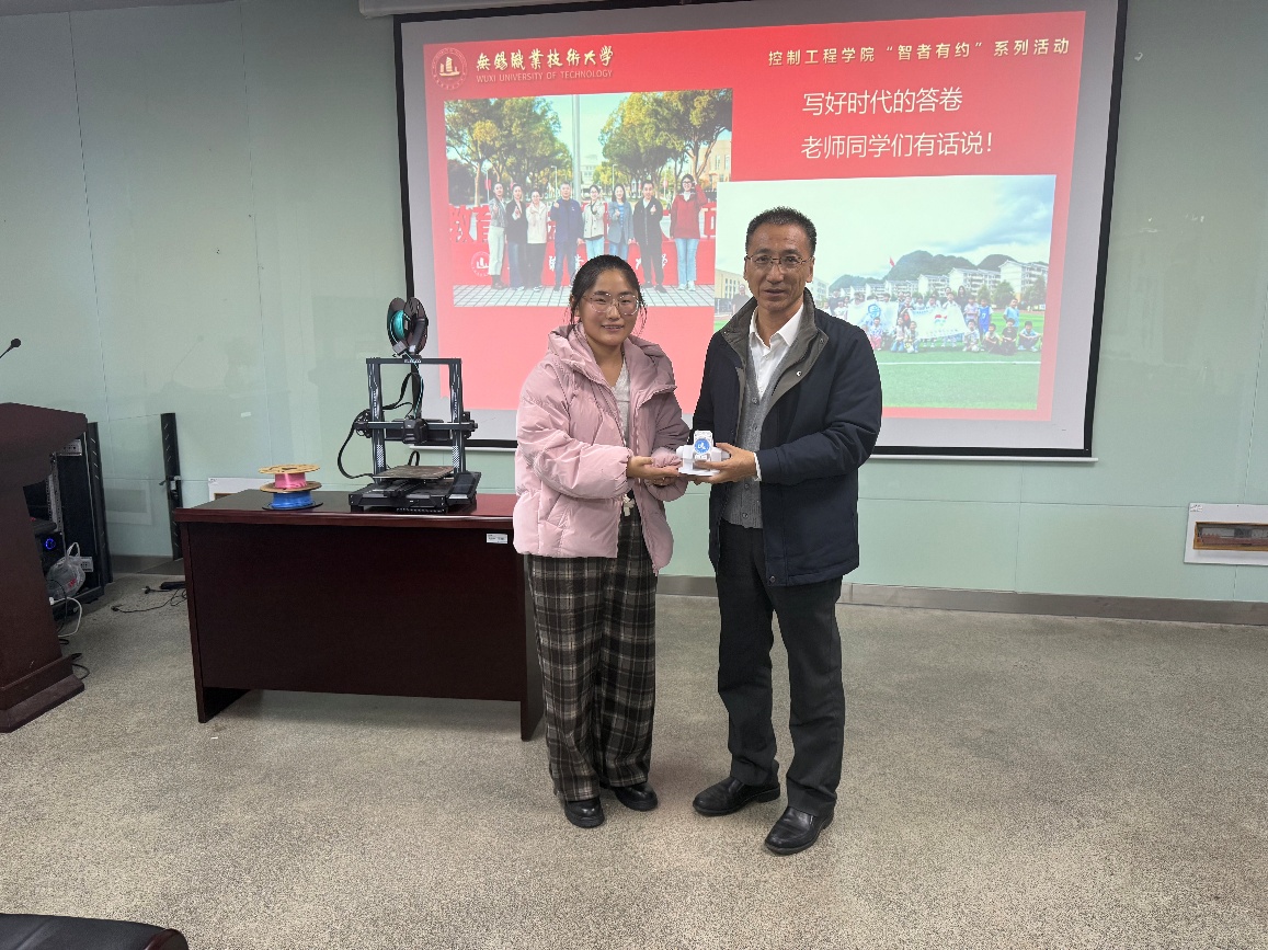 在写好时代答卷师生有话说环节,退役士兵曾鹏、“爱我国防”演讲团任怡颖和“智者同行”生涯发展工作室负责人周嫄,都结合学院专业赋能与时代机遇,分享了各自收获的独特成长与工作的感悟。随后机器人协会代表胡馨予还向龚方红赠送了LY-1型激光定向能武器模型,象征着控制学子铭记抗战烽火,传承科技强国信念的决心。