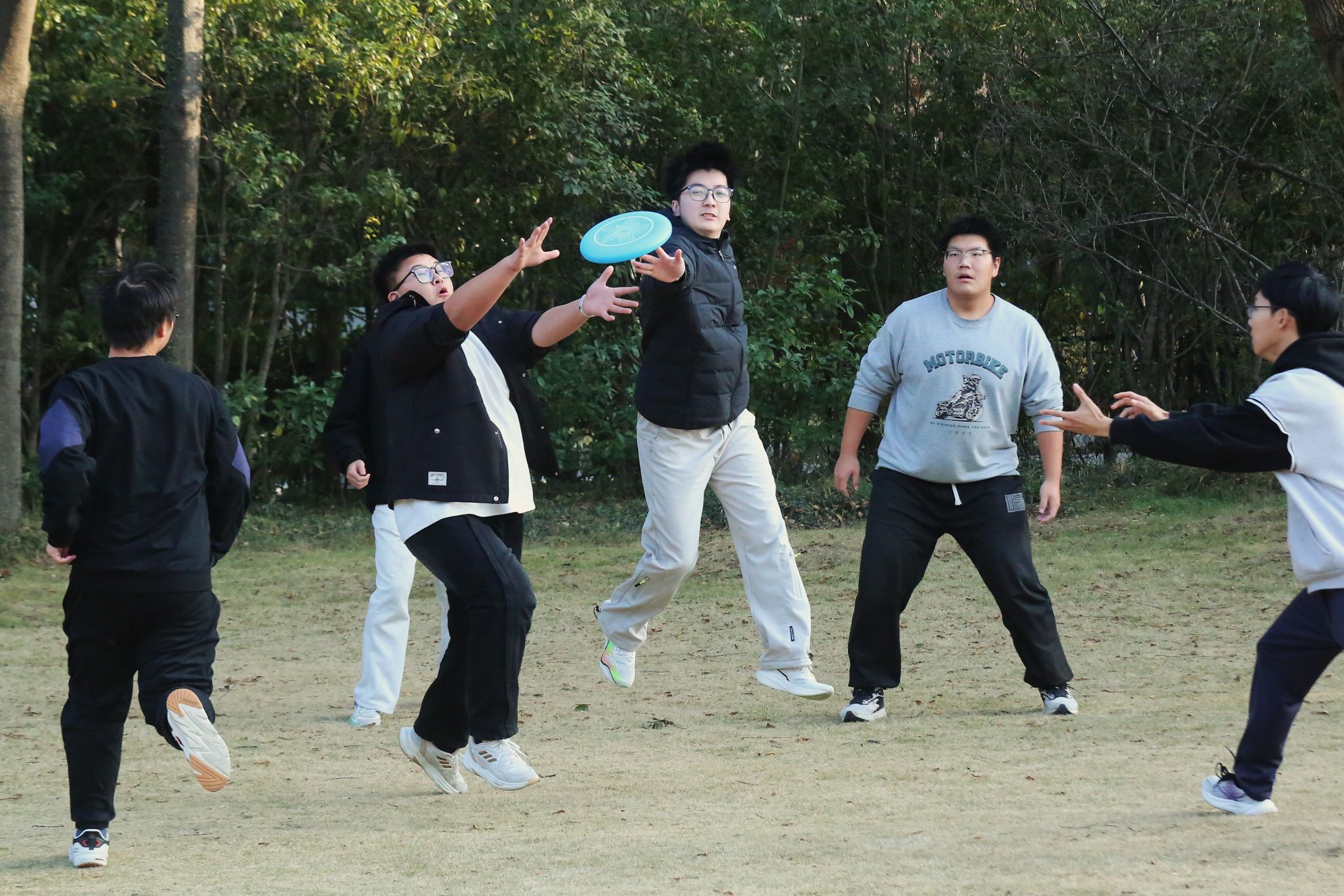 在公园北段的绿茵场,第一届飞盘大赛拉开帷幕。赛场巧妙利用公园的自然地形地貌设置了各自的攻守区域。比赛时,选手们身手敏捷,每一次跳跃、转身都流畅有力。他们紧盯着空中的飞盘,眼中闪烁着坚定与决心。飞盘在攻守转换中划出一道道优美的弧线,引得场边呼声连连。大家在锻炼身体的过程中享受乐趣、增强体质、健全人格、锤炼意志。最终,顾秋亮创新班25袁昊宇同学率领的战队获得了最终的冠军。