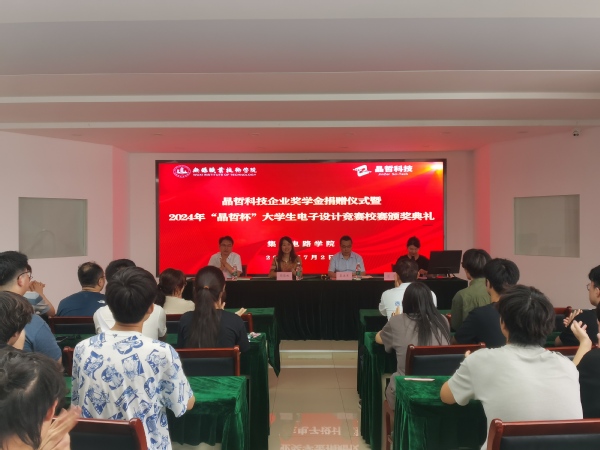 蔡建军首先感谢了无锡晶哲科技有限公司设立3万元企业奖学金,介绍了学院的近中期发展目标,并与企业签订了产学研合作协议。黄从贵宣读首届“晶哲杯”大学生电子设计竞赛校赛获奖名单,勉励大家再接再厉、勇攀高峰,再创佳绩,回报社会。