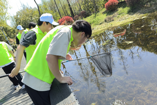 志愿者们利用自己的专业知识,从湖面垃圾治理的角度研发垃圾清理工具,同时向公众传递湿地环保理念,聚力推动绿色发展,促进人与自然和谐共生。师生在湖岸边认真仔细地寻找垃圾并捡拾归类,在浅水处调研漂浮物的形态、收集数据,为正在研发的水面垃圾清理机器人储备更充分的材料。