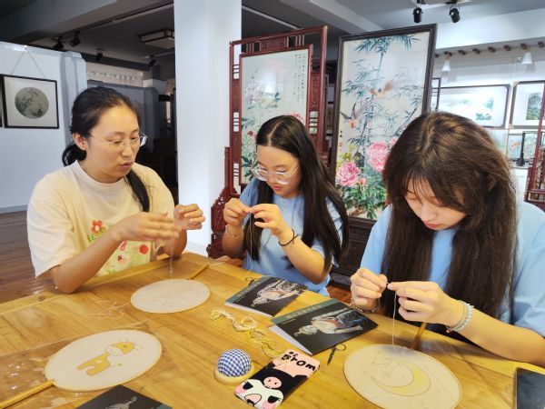 下午,蔡梅英老师的女儿把大家带到二楼的培训室,教大家做起了苏绣团扇,带领大家亲自感受苏绣的制作工艺。苏绣针法有平针、绕针、散套、虚实针、乱针、滚针、打子、抢针等。由于时间有限,大家先学习了起针和落针的基本方法和平针绣法。实践团队的同学们一开始叽叽喳喳、满是热情地挑选扇面。在学会基本绣法后便渐渐安静下来,一针一线、认真专注地开始了苏绣制作。过了一段时间,有几个同学已经有点失去了耐心,开始小声讨论起来。队员们纷纷不禁感叹,苏绣这个技艺确实需要超乎常人的耐心和定力,小小的一个色块,需要用掉接近半个小时的制作时间,更何况是想要把针脚保持一致的方向,更是难上加难。他们由衷的佩服苏绣手工艺人的十年如一日,甚至终其一生在一件事情上面精耕新作的“工匠精神”,也因此更加坚定了宣传苏绣的决心。