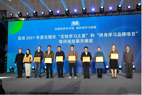 开幕式上宣读了无锡市“百姓学习之星”和“终身学习品牌项目”等评选结果,无锡市教育局副局长任克奇、无锡开放大学党委书记奚小网、无锡市成人教育协会会长张志新、惠山区教育局局长毛德祥等到会讲话并为获奖人员颁奖。我校刘贵锋老师主持的“无锡惠山街道非遗课堂”获 2021年无锡市“终身学习品牌项目”,继续教育学院曹冬美副院长获 2021年无锡市“社区教育先进工作者”称号。
