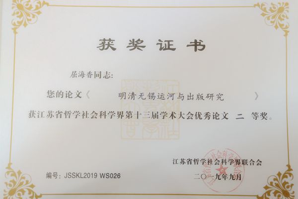 近日,江苏省哲学社会科学第十三届学术大会暨无锡市哲学社会科学第十届学术大会“文学与历史学”专场在江南大学举行,经过学术大会严格评审,产生了获奖论文40篇,其中一等奖11篇、二等奖29篇,我校任重威老师撰写的学术论文《< 诗经>生态价值观的认知形态与现实意义》、屈海香老师撰写的学术论文《明清无锡运河与出版研究》分获学术大会优秀论文二等奖,集中展示了我校青年教师对优秀传统文化内涵及江南大运河人文价值和文化意义的探索和思考。