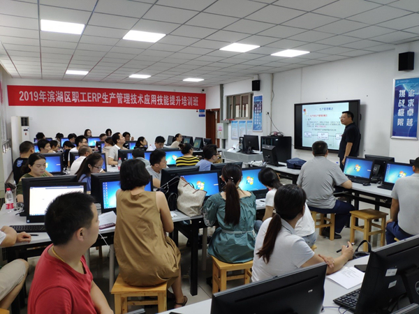 8月4日上午,2019年滨湖区职工ERP生产管理技术应用技能提升培训班在我院明德楼202举行开班仪式,管理学院院长冯臻、副院长郑爱翔、项目管理人员、培训教师,以及来自滨湖区各街道的30多名企业员工参加了开班仪式。