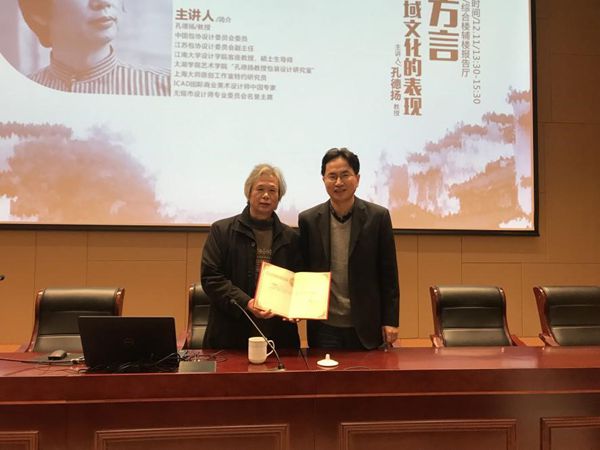 12月11日,江南大学设计学院教授、硕士生导师孔德扬教授的专题讲座在我校综合楼辅楼报告厅举行。艺术与设计学院院长助理刘姣姣主持,艺术与设计学院党总支罗嘉军书记、孟剑飞副院长及各系部专业教师、学生代表共200余人聆听了孔教授题为“视觉方言——吴文化与视觉设计语言”的讲座。