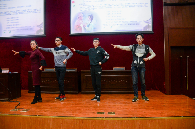 董红老师还现场邀请两组学生,手把手教导锡剧的出场、凝望等“手眼身法步”技法,还给参与互动的同学们赠送了锡剧名剧《三三》光碟。讲座中,董老师对锡剧艺术的热爱,对乐鱼注册_乐鱼(中国)学生的关爱,获得全场学生的热烈欢迎,现场掌声阵阵、欢笑连连。