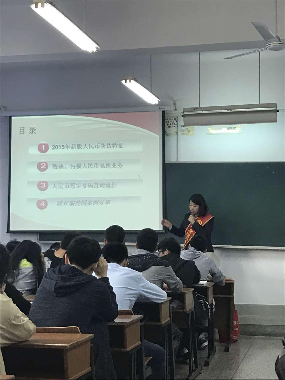 活动在明德楼C207教室开展。分行运营与科技部的张咪为同学们介绍2015版新版人民币防伪知识及消费者权益,同学们全面了解到客户的权利和义务,对误收假币、遇到假币纠纷时处理方法。随后,分行人员还组织同学们进行校园反诈骗案例分析并开展反假知识竞答,同学们都踊跃参与其中。