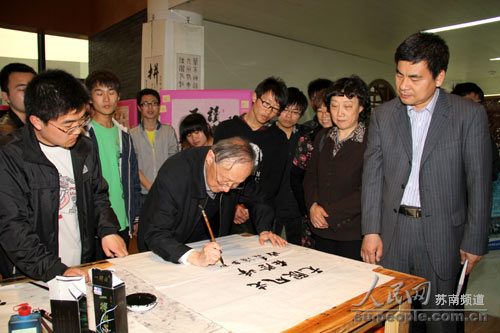 当天上午,杨叔子院士仔细观看了艺术设计系学生的绘画作品、校史陈列馆、机械技术学院数控创新班学生操纵五轴联动加工中心及试制的产品,并与部分教师进行了座谈。在实地考察中,他对学校留下了美好的印象,认为无锡职院欣欣向荣,大有可为。当学校领导表示聘他为机械工程、素质教育客座教授时,杨叔子院士随即答应。