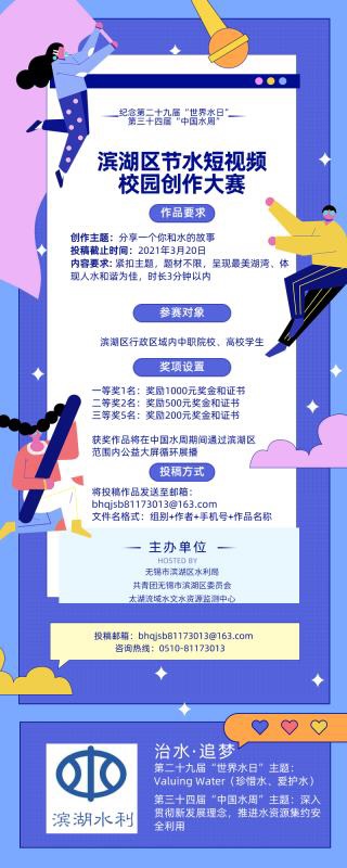 为了迎接即将到来的第二十九届“世界水日”(3月22日)、第三十四届“中国水周”(3月22日-28日),激发广大青年学子投身美丽湖湾建设的热情、唤醒蕴藏心底的水美“乡愁”,由共青团无锡市滨湖区委员会、无锡市滨湖区水利局、太湖流域水文水资源监测中心联合举办的“分享一个你和水的故事”节水短视频校园创作大赛开始征募投稿啦!