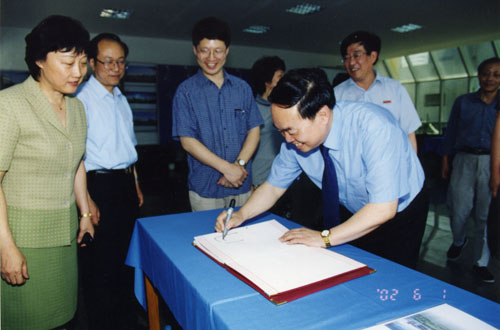 2002 年 6 月 1 日,教育部部长周济(左一)在视察我院时题词情景。